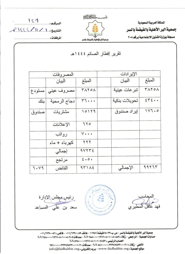 - تقرير عن الإيرادات النقدية و العينية لمشروع إفطار صائم لعام 1444هـ